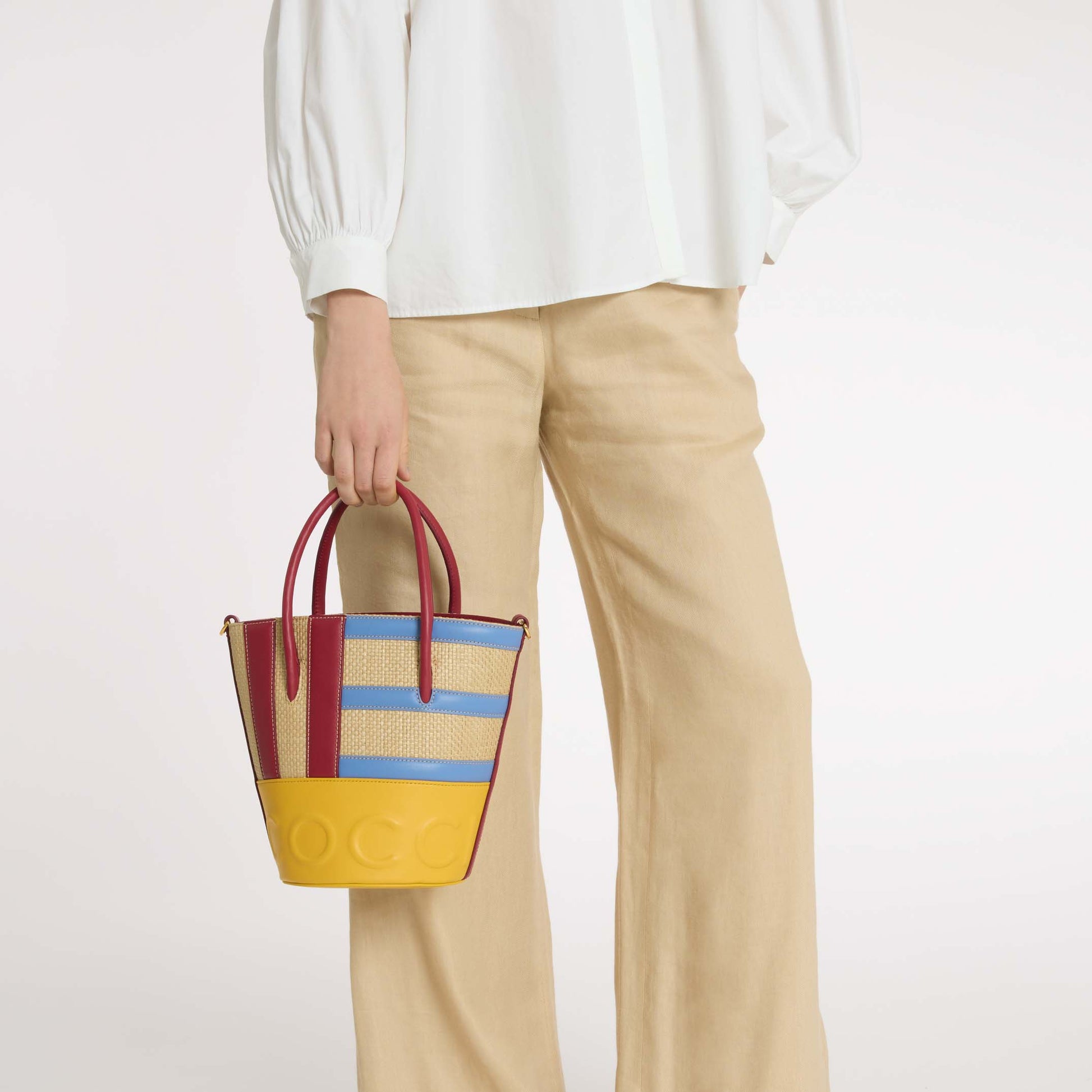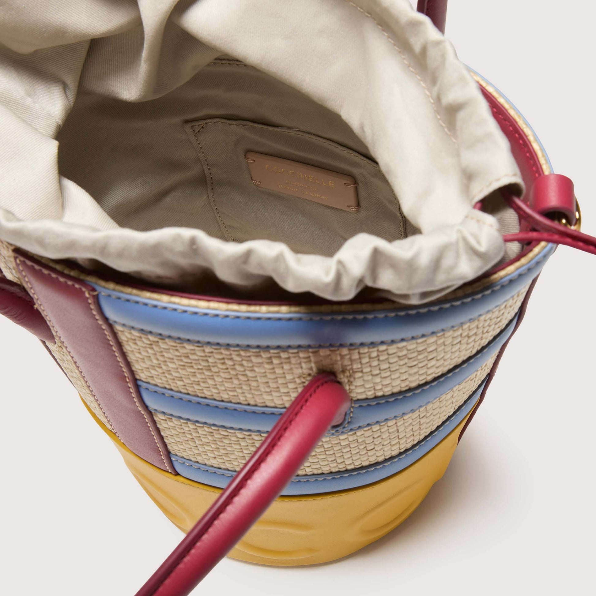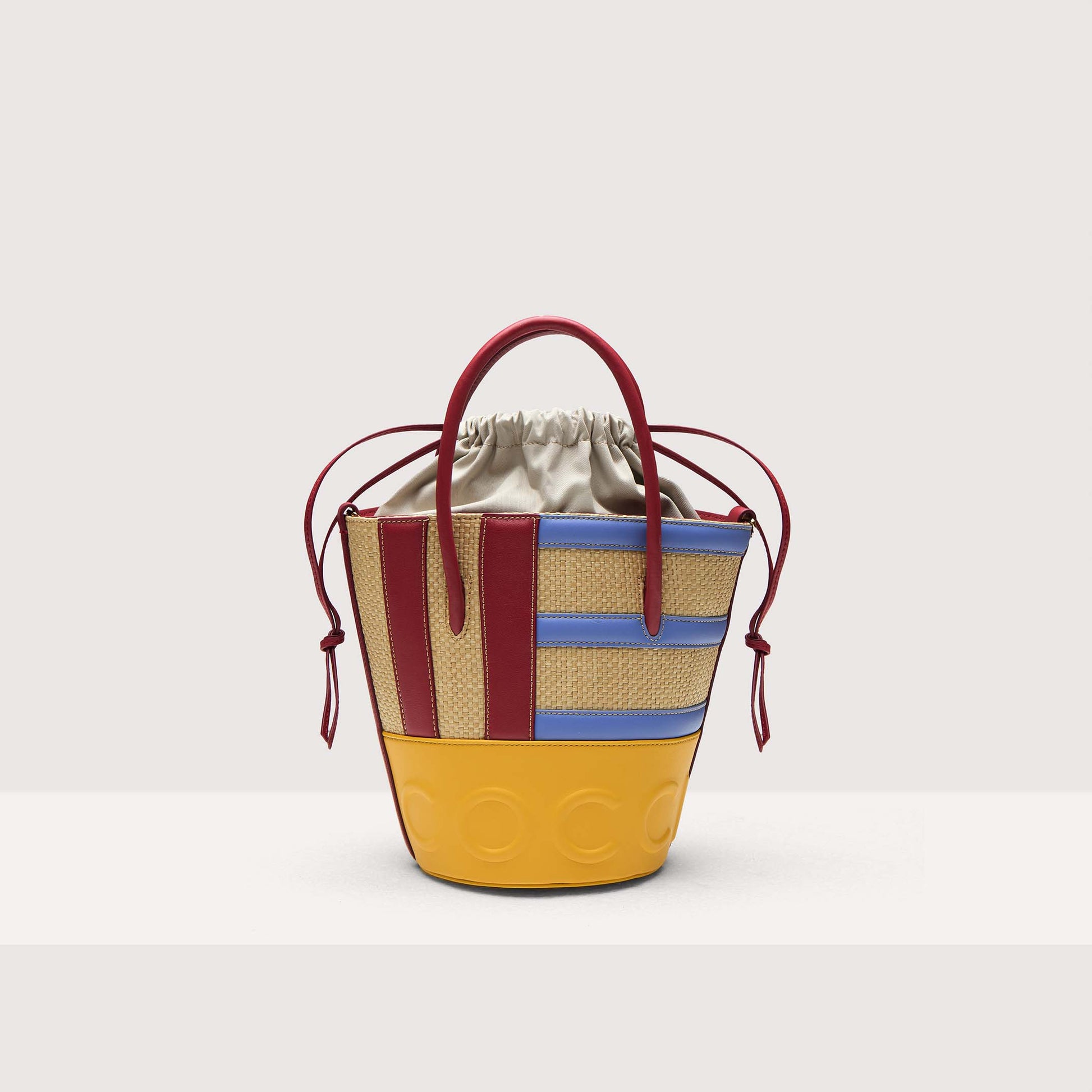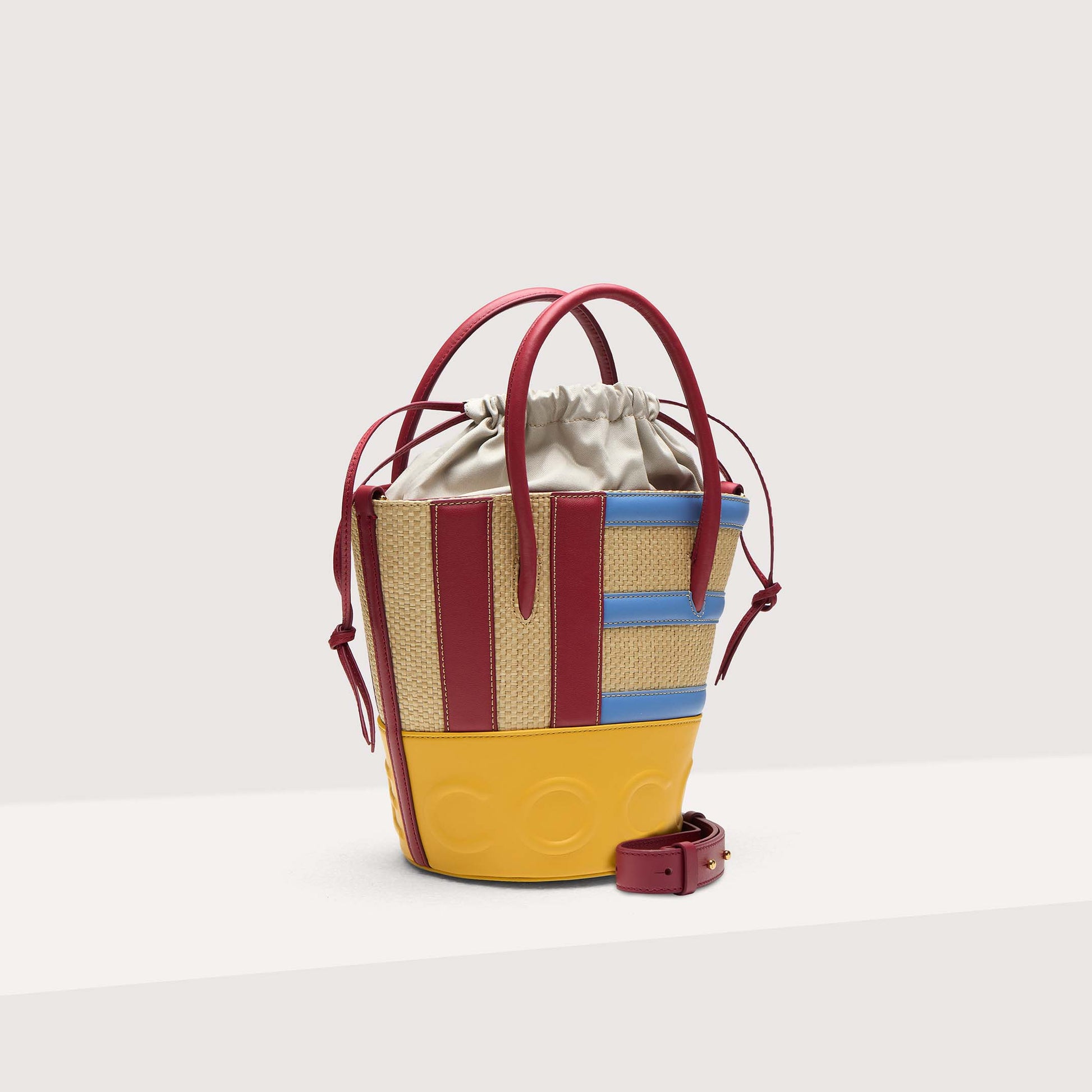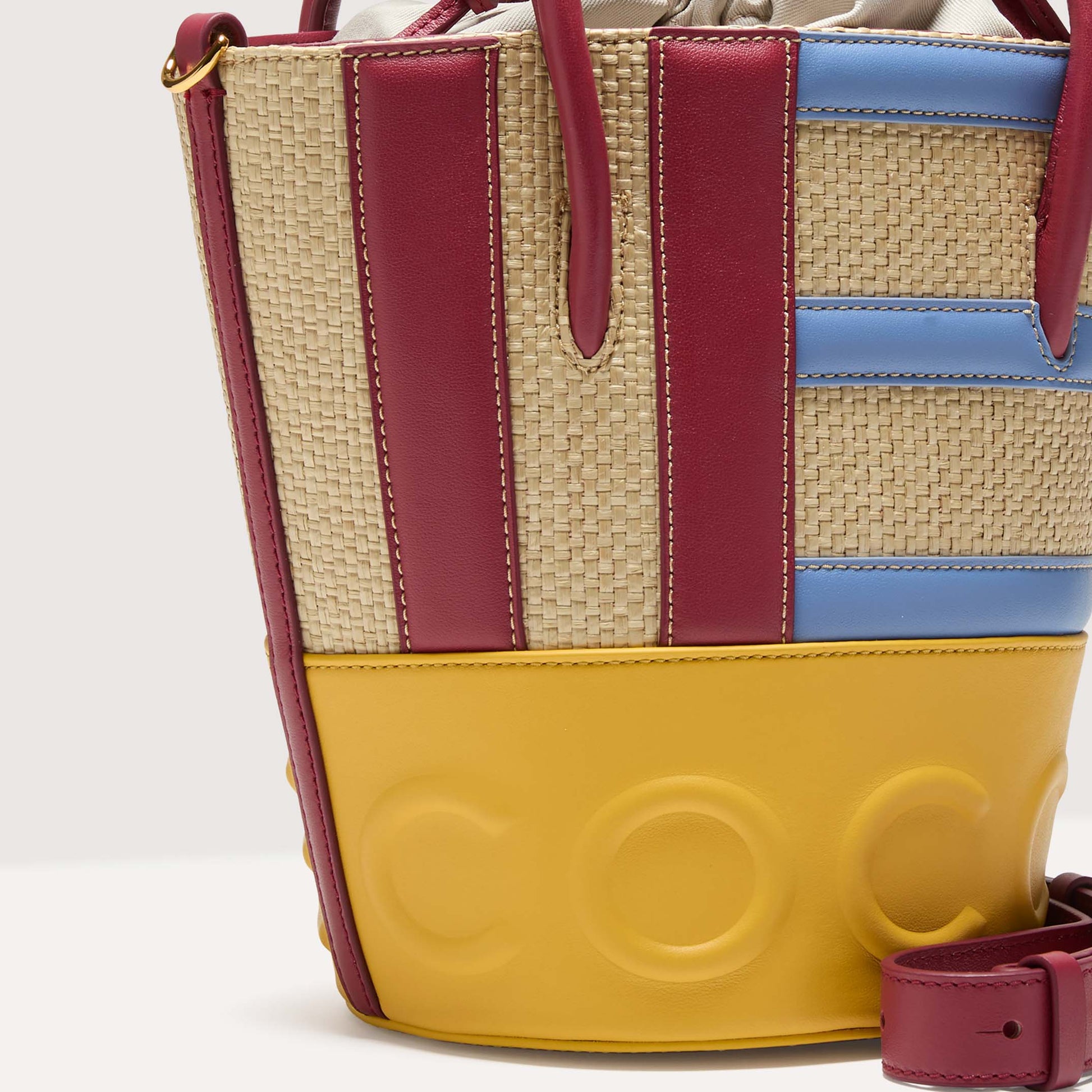 The Coccinelle Myrtha is a practical and trendy bucket bag you cannot do without, featuring the maxi “Coccinelle” logo. Ideal for everyday use, with a drawstring closure and an interior designed to keep all your essentials neatly organised. This model is made of smooth leather strips of different sizes applied vertically and horizontally on a straw base.
