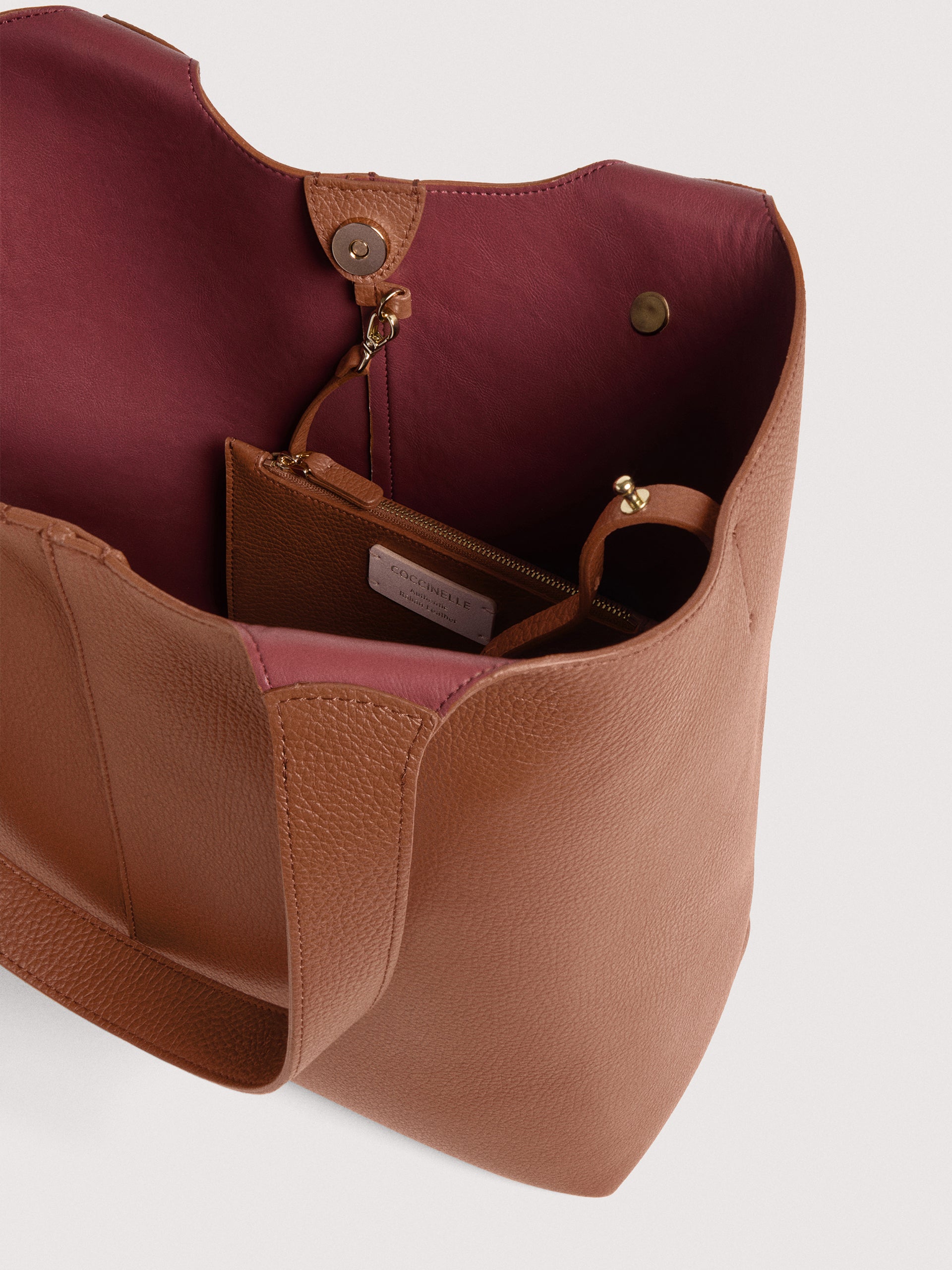 Coccinelle C-Easyは、レザーの美しさを引き立てるしなやかな曲線で形作れられたトートバッグです。 容量とインナーポーチが付随し、デザインの特徴としては、マグネット式の中央で開閉ができ、サイドを開いたままにすることも、レースとボタンスタッドクロージャを通してサイドを折りたたむことも可能です。 非常に汎用性の高いこのバッグを輝かしてくれるのはハンドル部分の新しい金属製のC-Meロゴです。 このモデルは特殊な機械で加工したレザーで作られており、その柔らかさを維持するためにタンブリング加工が施されてます。 非常に丈夫でお手入れの簡単なレザーなので、日常の使用に最適です。