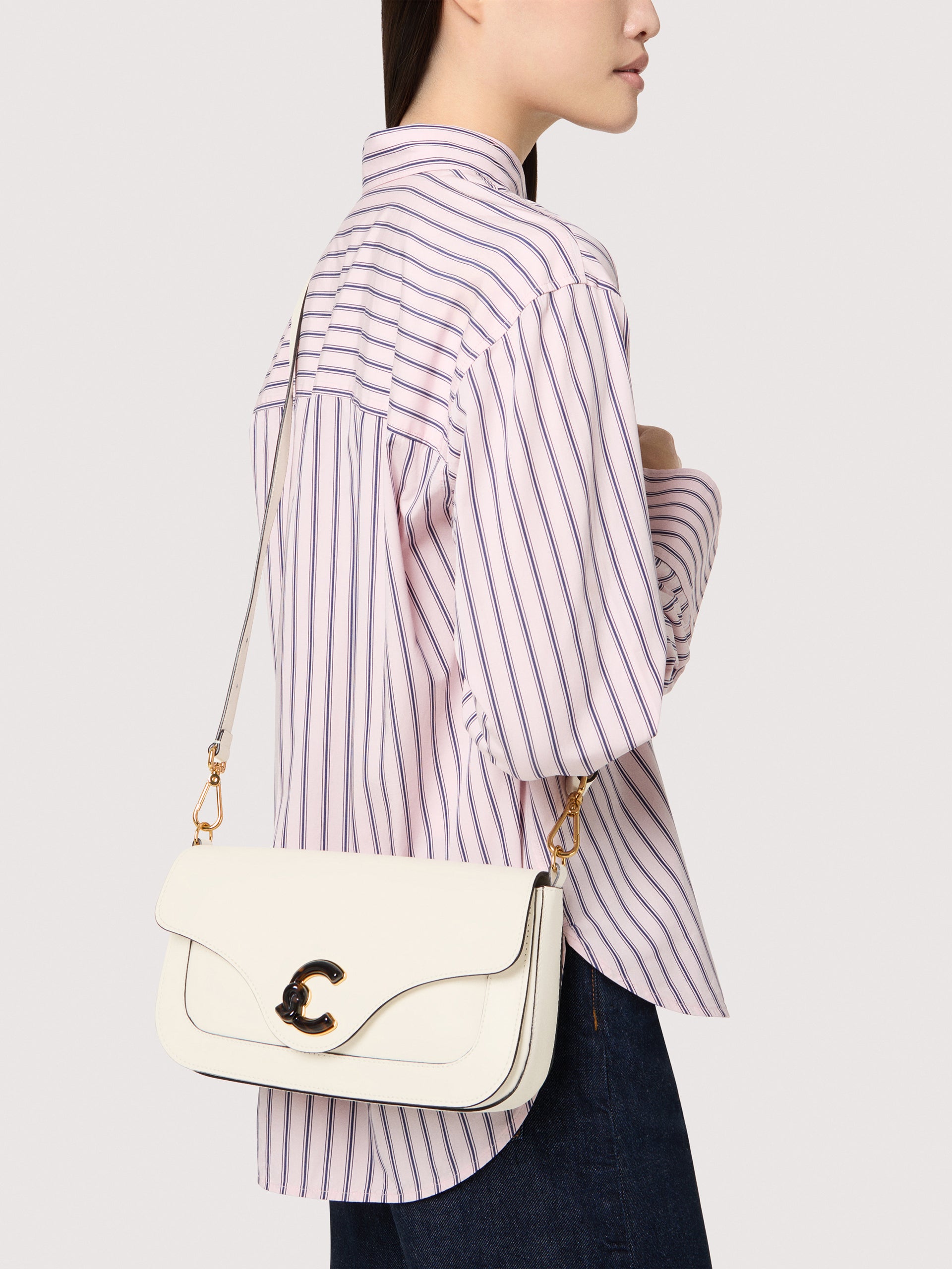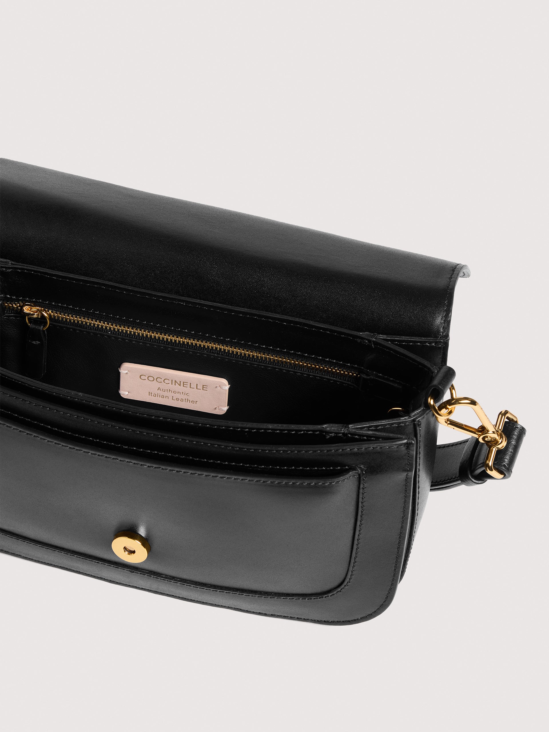 新しいブランドの象徴:コチネッレ C-ME。この新しいロゴはブランドのアイコンであるプレクトラムとブランドの頭文字”C"が統合したもので、女性の人生の過去と未来が絡み合いながら流れる様子を象徴してます。幾何学的なラインと洗練された曲線と、ガセット構造は機能性と細やかな優雅さをブレンドしたバッグで、コチネッレを愛する女性にとって毎日欠かせないバッグとなってます。本モデルは滑らかな革製で、特殊なオイルでなめすことで耐久性と併せて洗練された外観を実現しています。