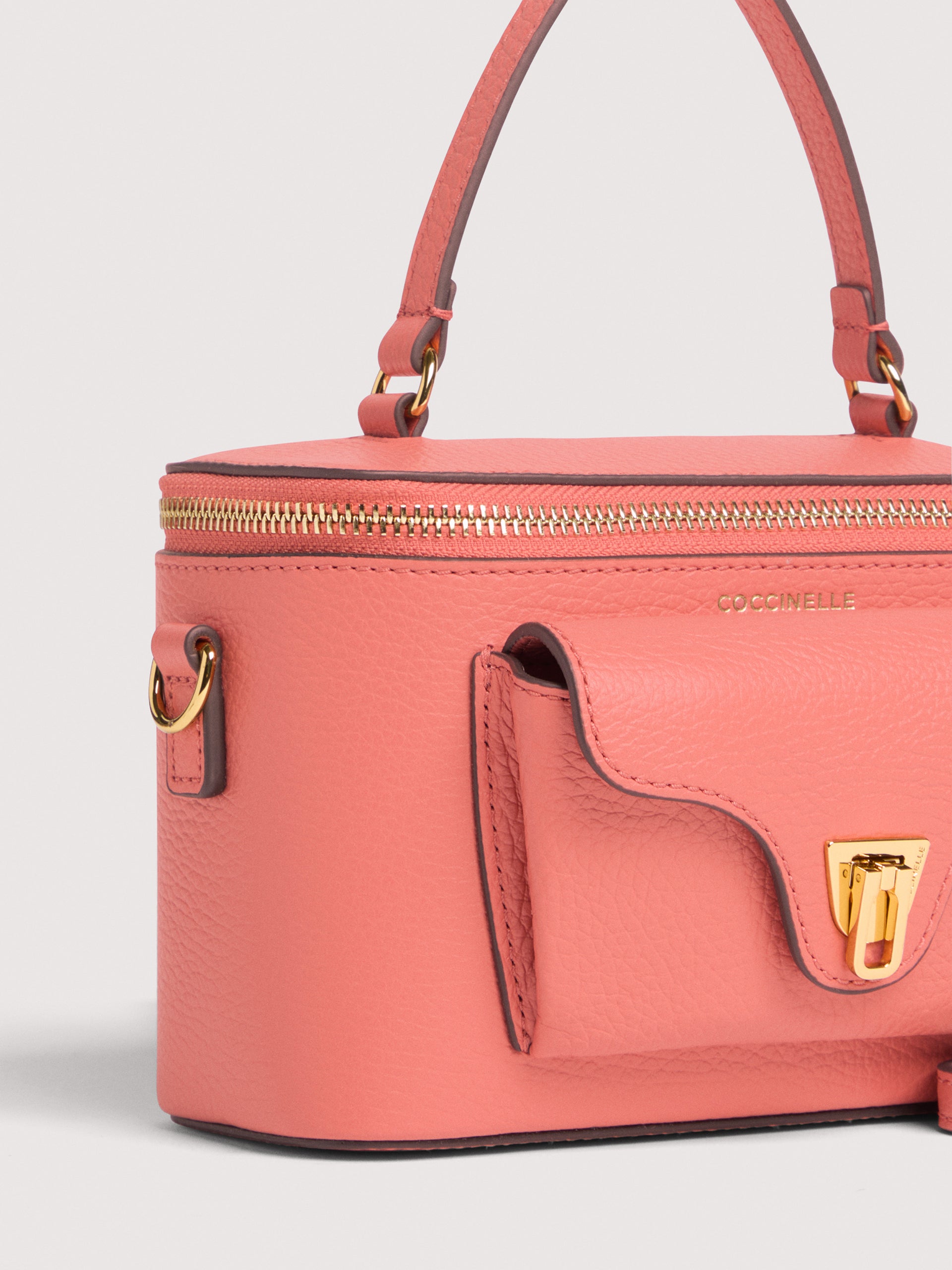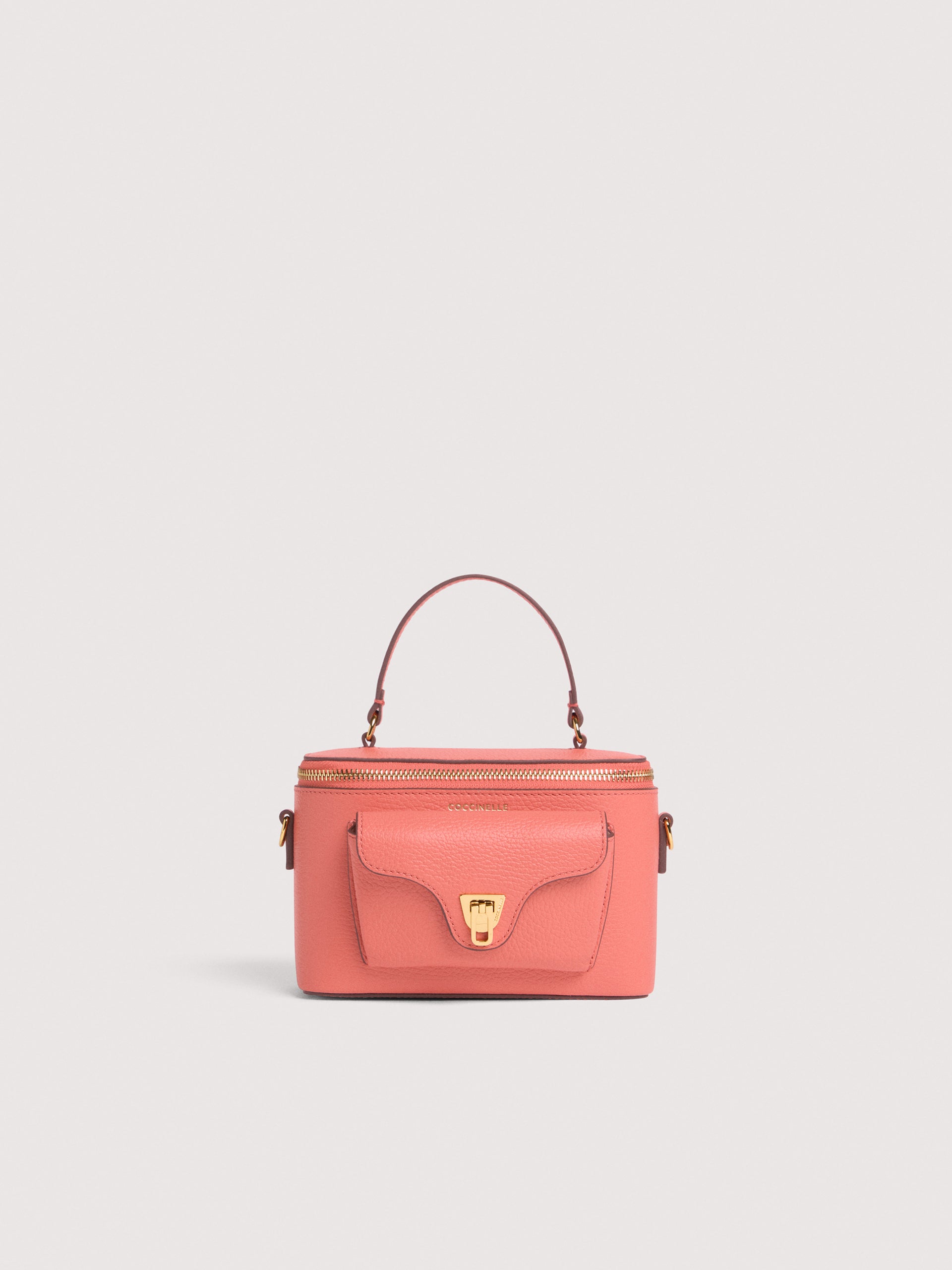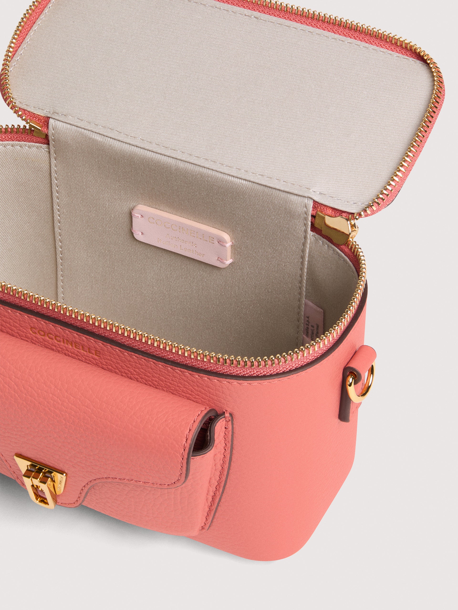 コチネッレ Beatはブランドの象徴的なラインの一つです。アイコニックな金具のついたフラップクロージャーはこのコレクションのためにより洗練されたものになりました。レザーショルダーストラップ付きのミニバニティケースは、構造と柔らかさ、実用性と現代的なデザインが完璧にミックスされています。 このモデルは特殊な機械で加工したレザーで作られており、その柔らかさを維持するためにタンブリング加工が施されています。非常に丈夫で、お手入れの簡単なレザーであるため、日常の使用に最適です。