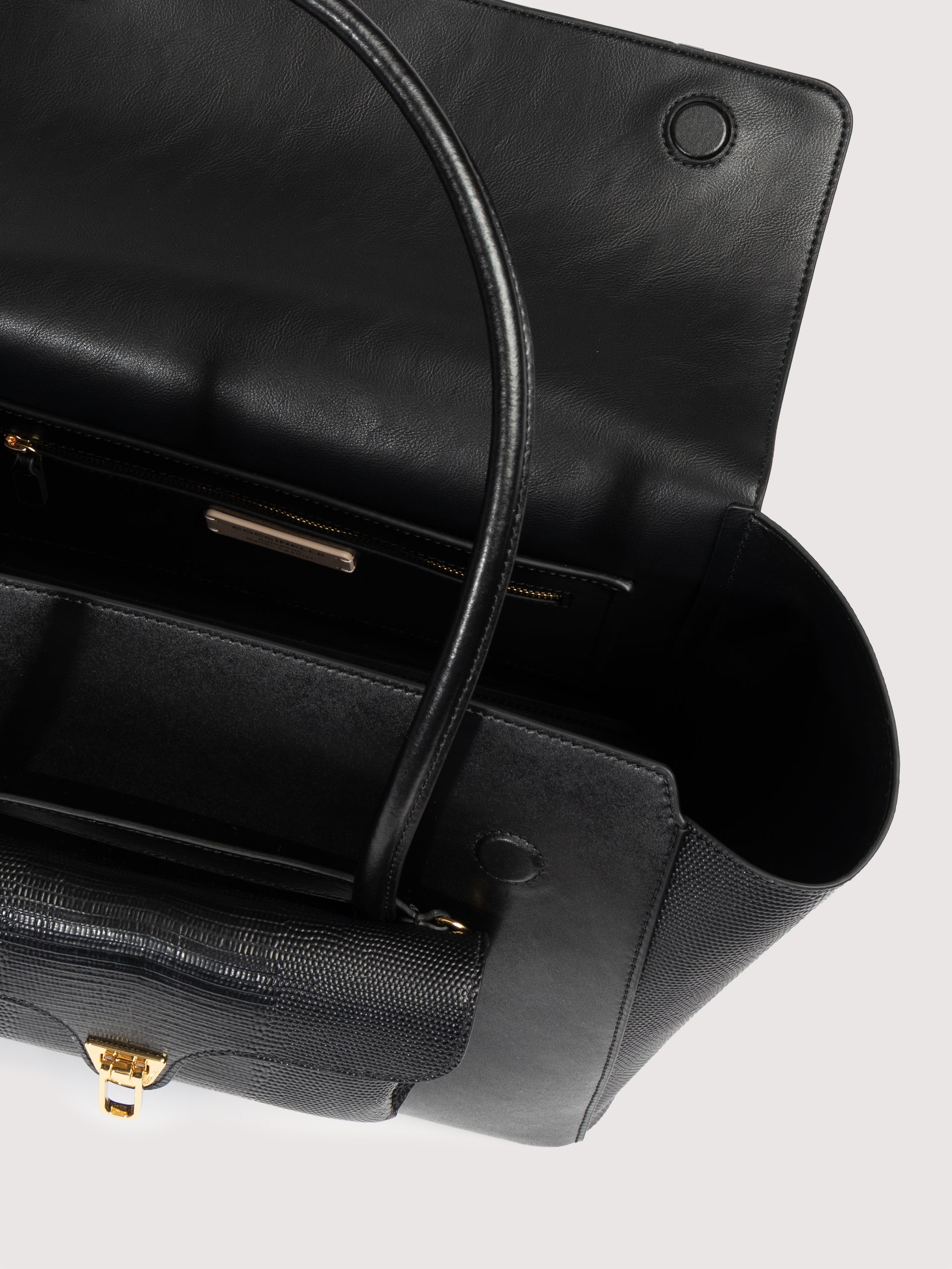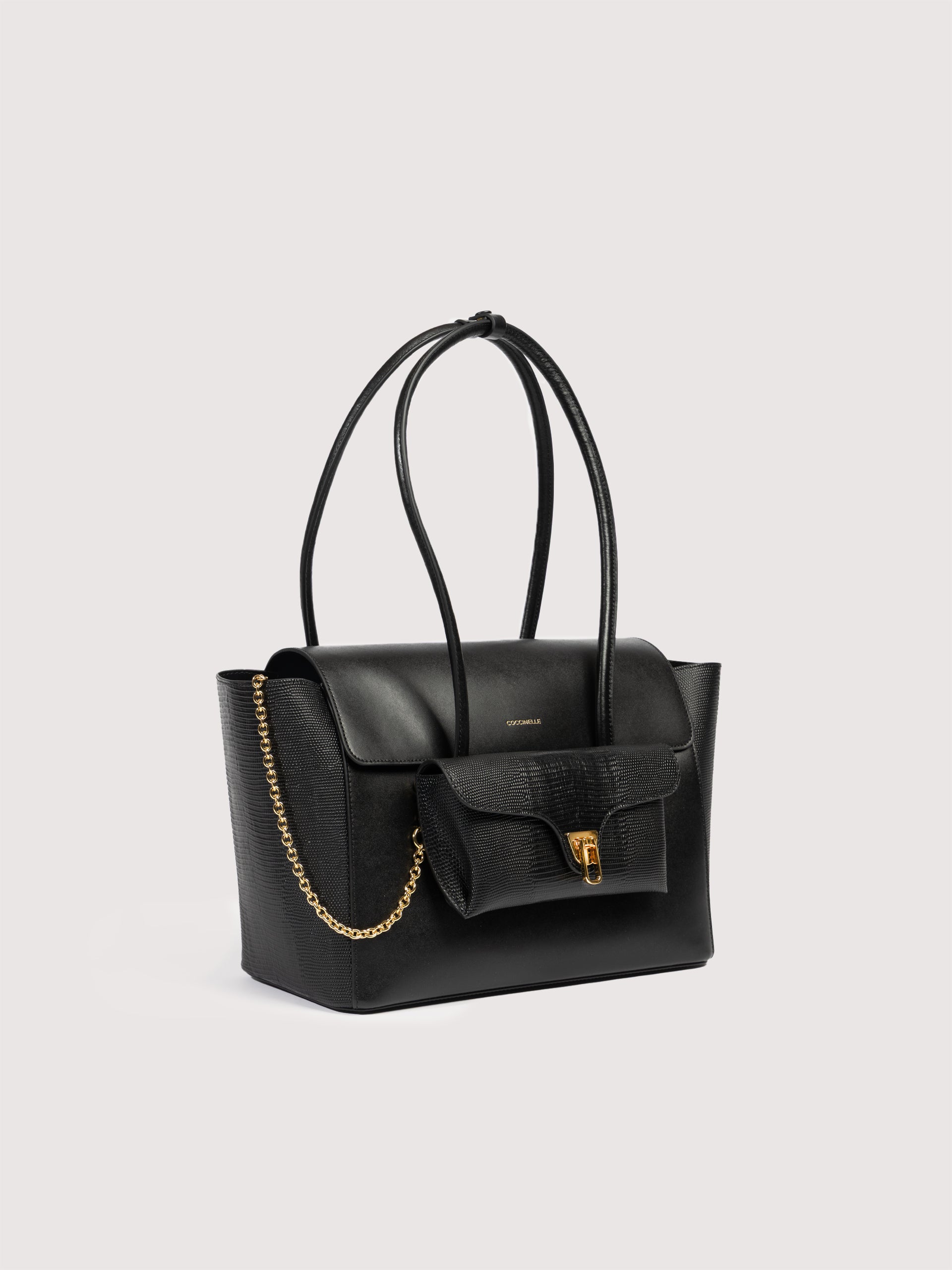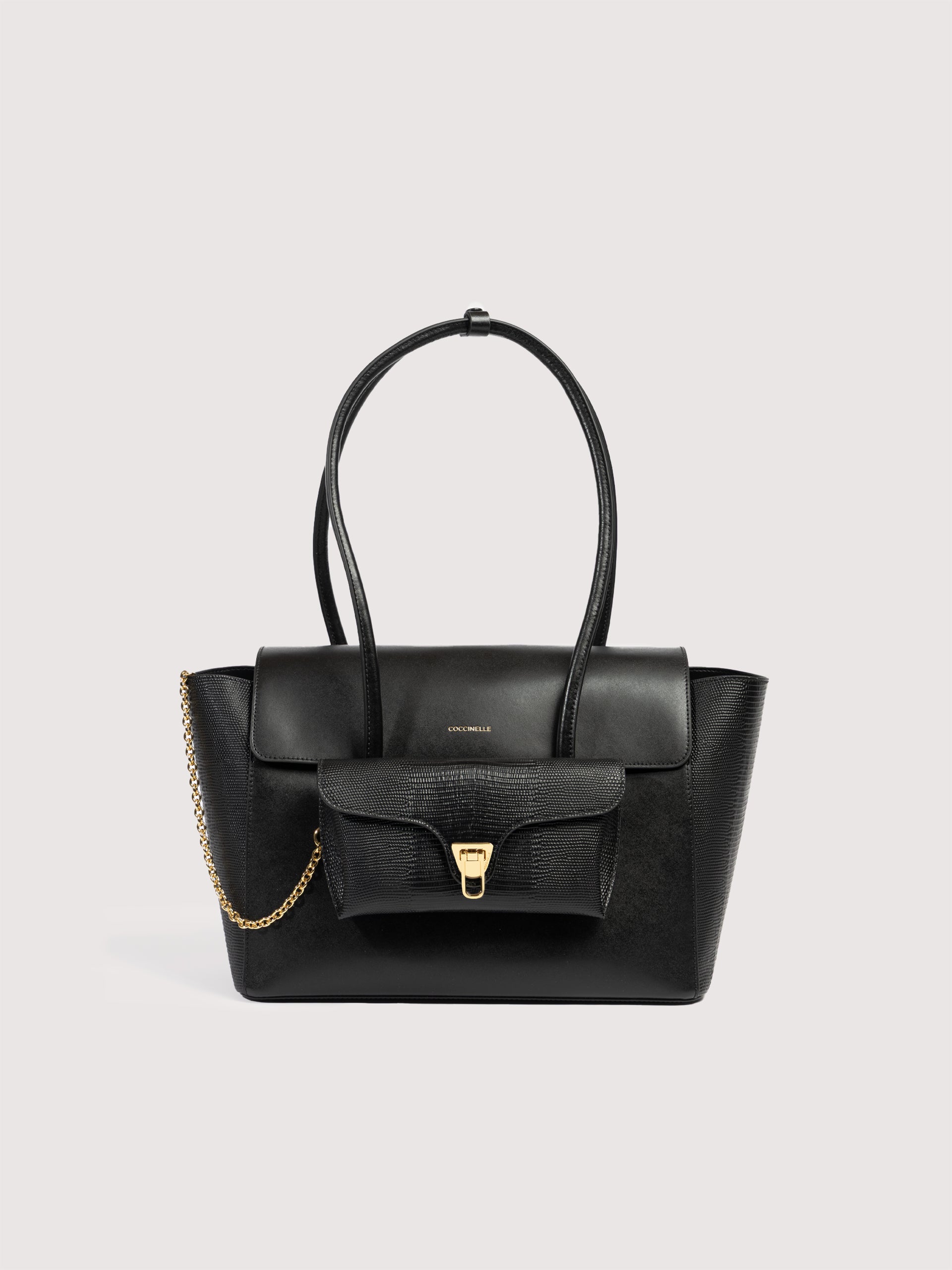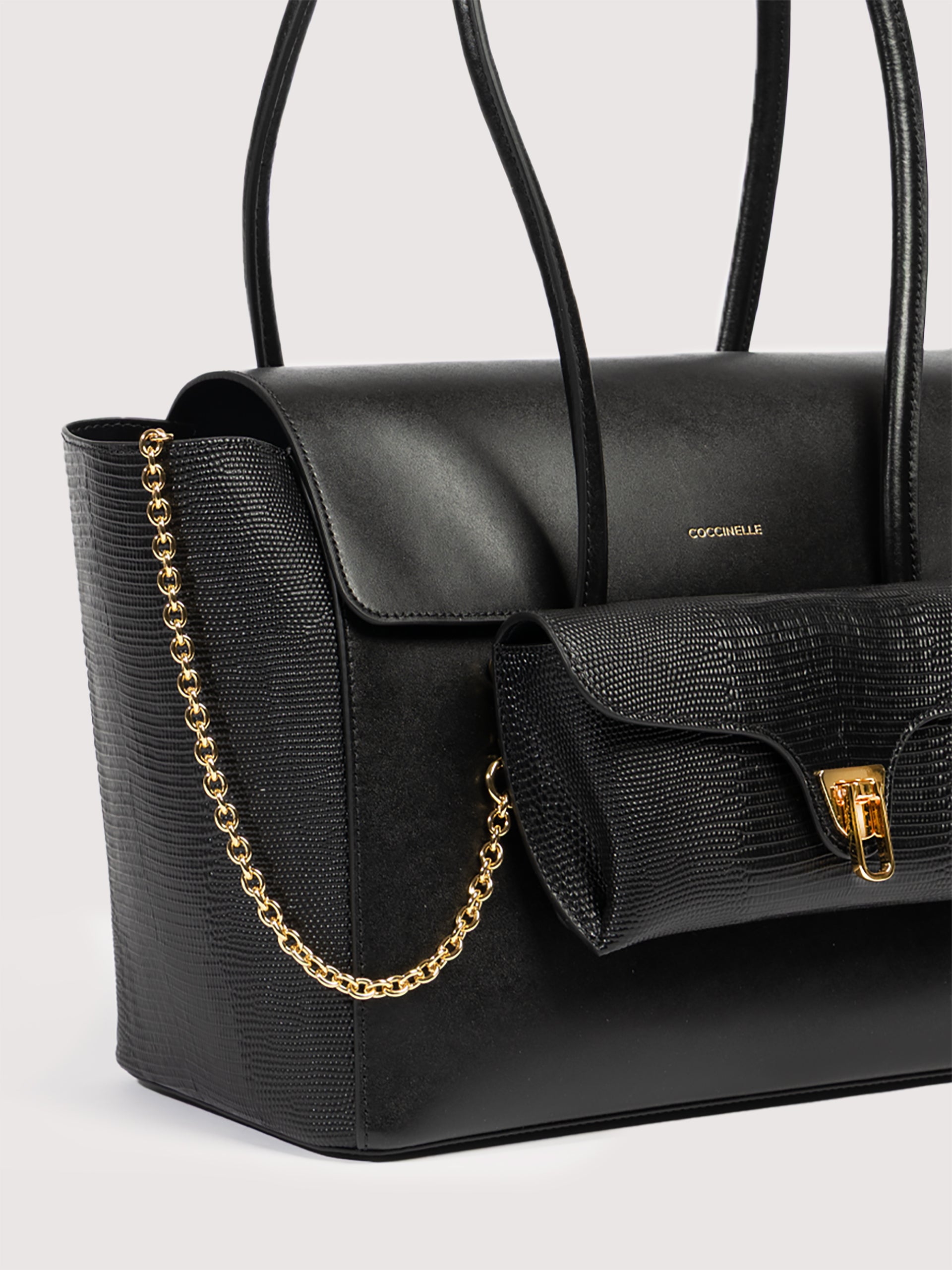 Coccinelle Double Beatは、チューブ状のハンドルでショルダーバッグとして着用できるように設計された容量のあるフラップバッグです。 革新的な仕掛けのおかげで、コチネッレのアイコンである金具付きフロントポケットは取り外し可能で、実用的なポーチやエレガントなクラッチとしてお使いいただけます。 このモデルは特殊な機械で加工したレザーで作られており、その柔らかさを維持するためにタンブリング加工が施されています。非常に丈夫で、お手入れの簡単なレザーであるため、日常の使用に最適です。