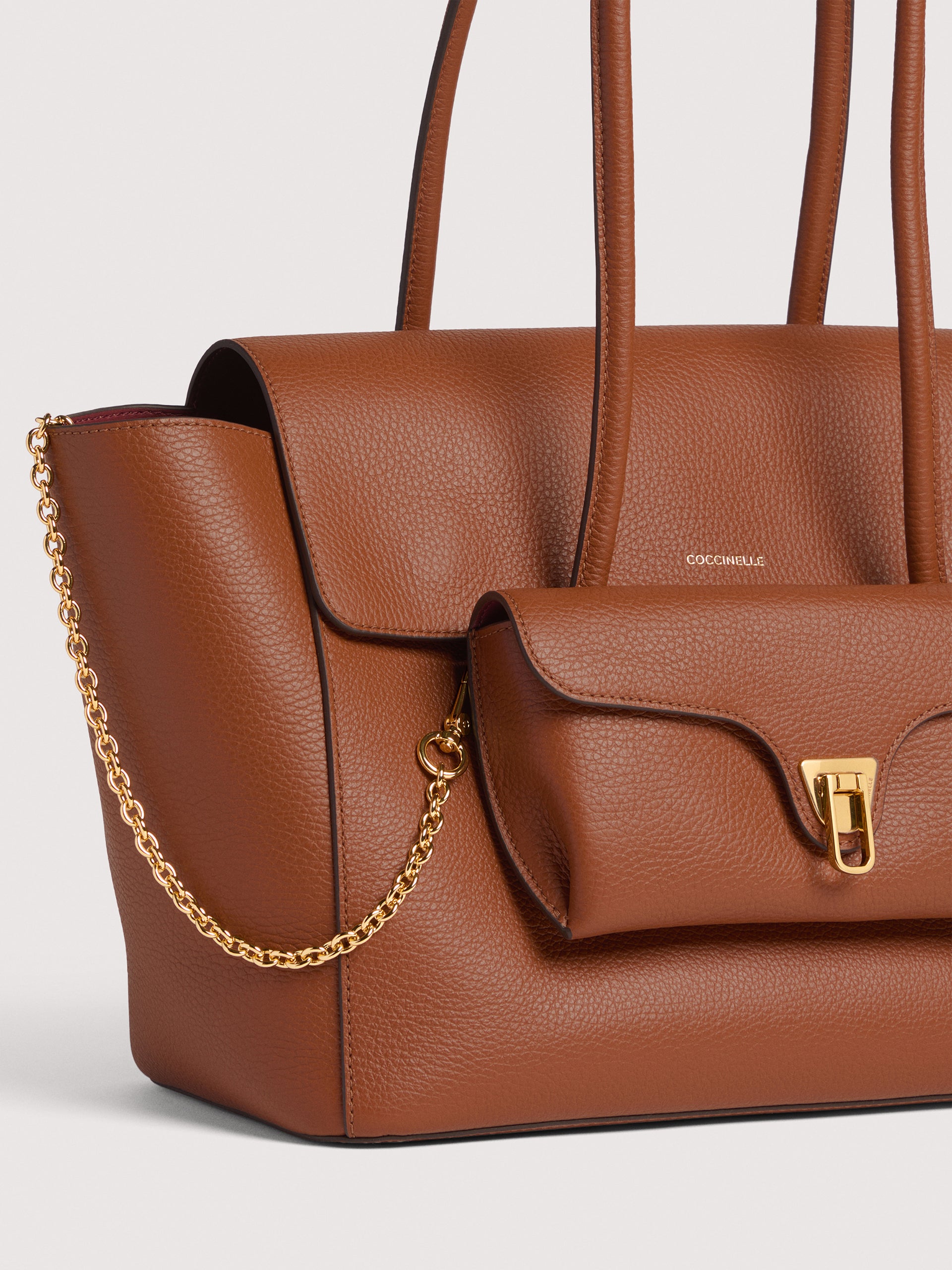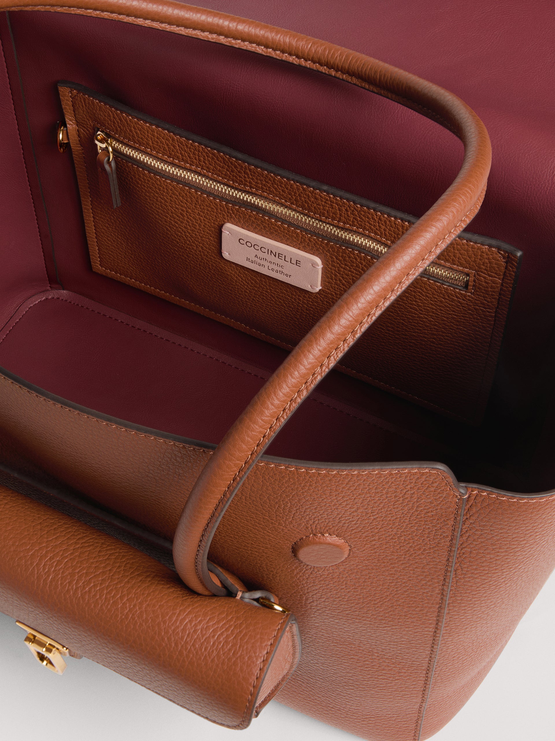 Coccinelle Double Beatは、チューブ状のハンドルでショルダーバッグとして着用できるように設計された容量のあるフラップバッグです。 革新的な仕掛けのおかげで、コチネッレのアイコンである金具付きフロントポケットは取り外し可能で、実用的なポーチやエレガントなクラッチとしてお使いいただけます。 このモデルは特殊な機械で加工したレザーで作られており、その柔らかさを維持するためにタンブリング加工が施されています。非常に丈夫で、お手入れの簡単なレザーであるため、日常の使用に最適です。