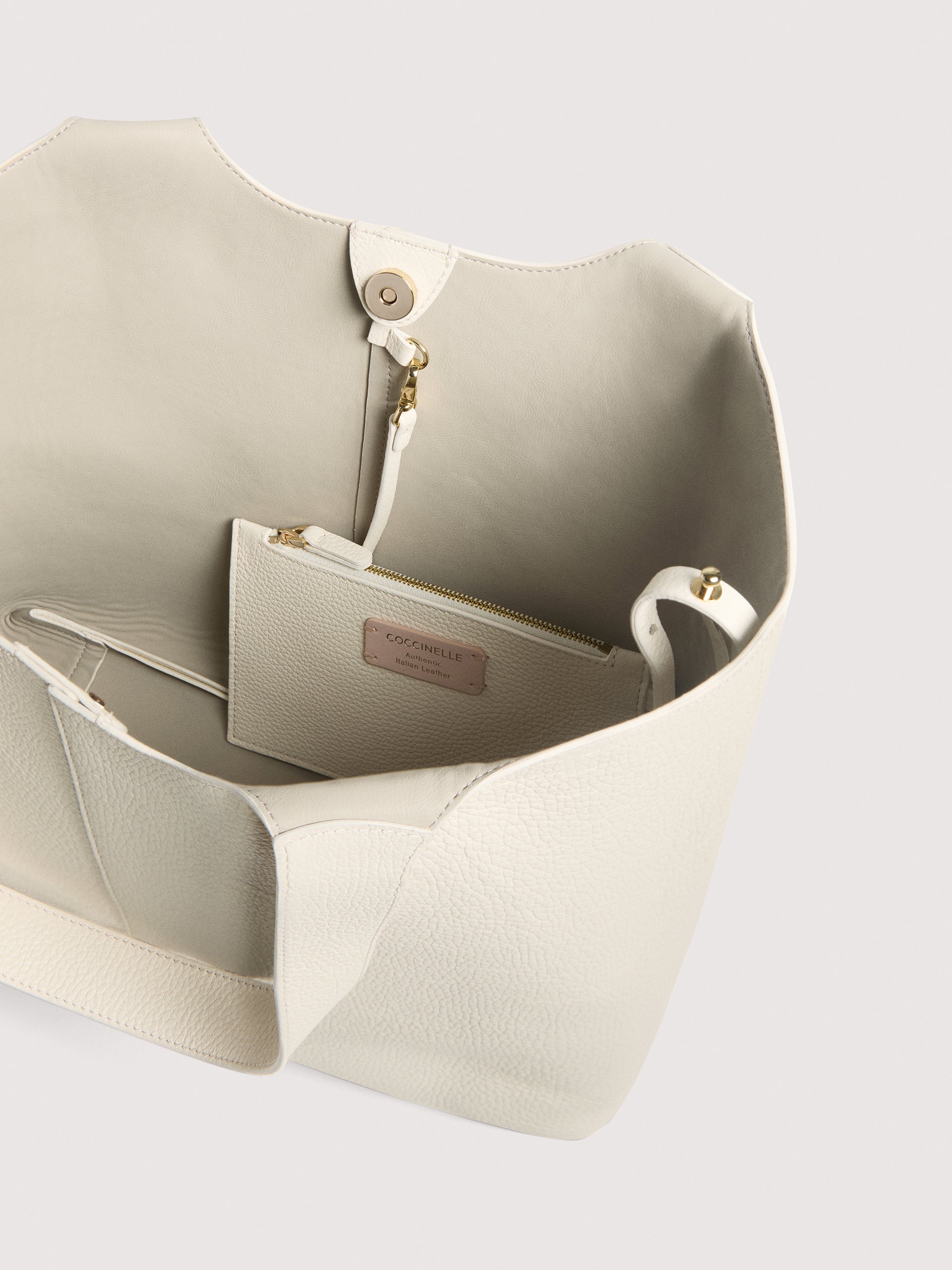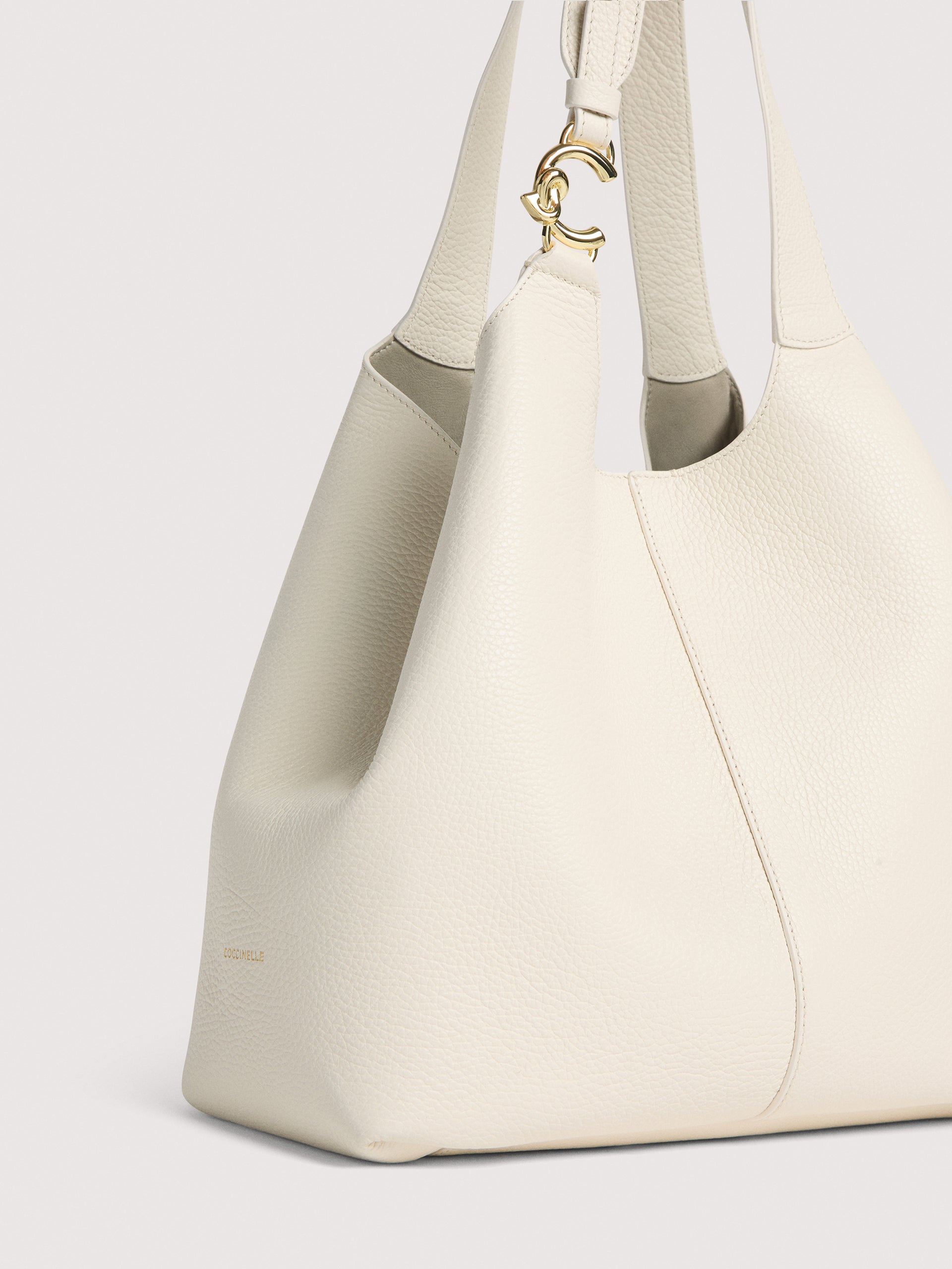 Coccinelle C-Easyは、レザーの美しさを引き立てるしなやかな曲線で形作れられたトートバッグです。 容量とインナーポーチが付随し、デザインの特徴としては、マグネット式の中央で開閉ができ、サイドを開いたままにすることも、レースとボタンスタッドクロージャを通してサイドを折りたたむことも行可能です。 非常に汎用性の高いこのバッグを輝かしてくれるのはハンドル部分の新しい金属製のC-Meロゴです。